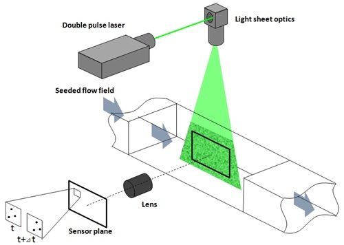 PIV是通过激光片光源测量所设定的平面内速度分布的成像技术,它被广泛用于各种流体研究,PIV是 so-called Time of Flight (TOF) 测量技术之一。PIV技术的基本原理是使用激光片光源为流场做照明,测量流动可视化的颗粒。一个双脉冲YAG激光和双快门相机,能同步记录2张粒子图像, 两张图像的间隔时间非常短,一般小于100us.